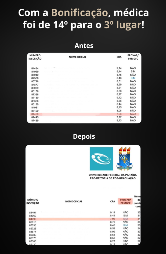 Isso causa uma diferença no resultado final do processo seletivo. Alguns médicos, depois de conseguirem a implantação dos 10%, saíram da 14ª colocação (sem a bonificação) para a 3ª colocação (depois da bonificação).